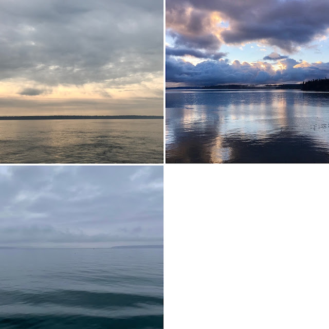 The collages this week include: Jennifer photographing a Great Lake, Sheboygan, WI (Jan. 2023); midmorning on Mama’s birthday, Bainbridge Island, WA (Mar. 2023); a shelter-in-place glory, Bainbridge Island, WA (May. 2020); Deception Pass from the bridge above, Whidbey Island (2018); a while after sunrise, Kingston, WA (Aug. 2018); Puget Sound (Aug. 2017); and the ferry ride from Bainbridge to Seattle (Mar. 2022).